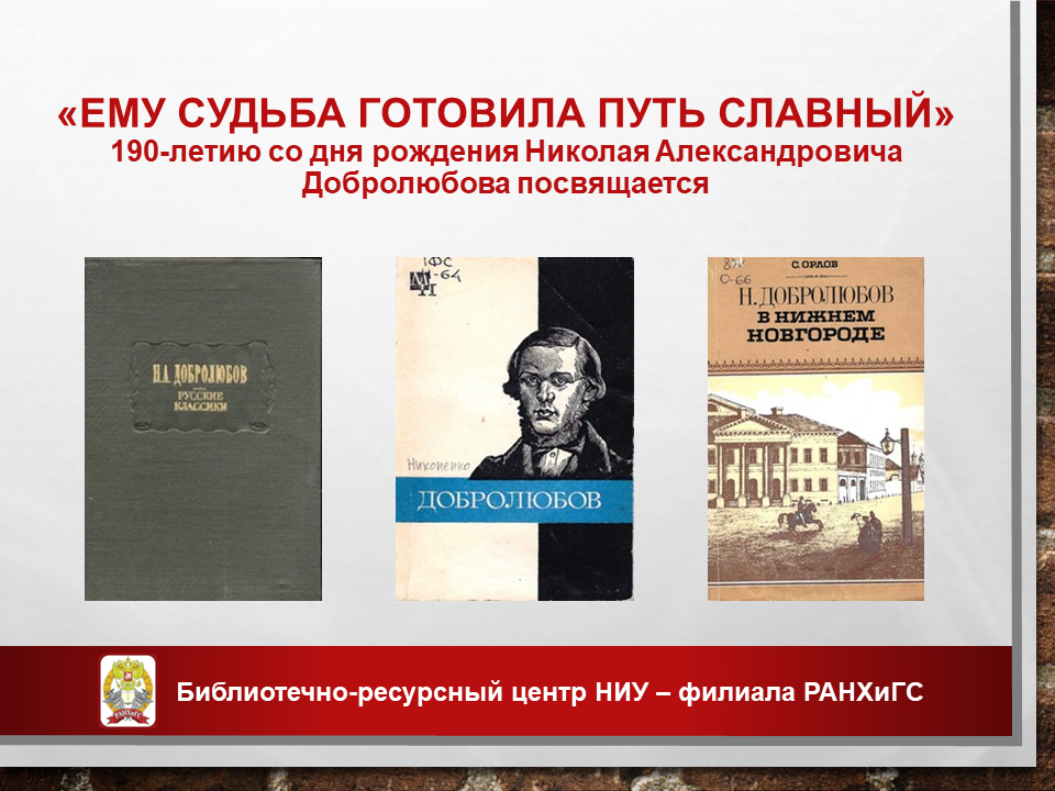 Книжная выставка «Ему судьба готовила путь славный» посвященная 190-летию со дня рождения Николая Александровича Добролюбова