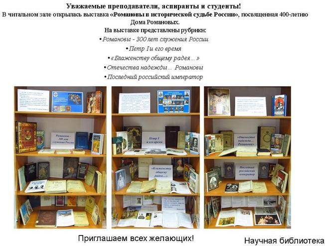 Главная » Новости библиотечно-ресурсного центра » В читальном зале открылась выставка «Романовы в исторической судьбе России»