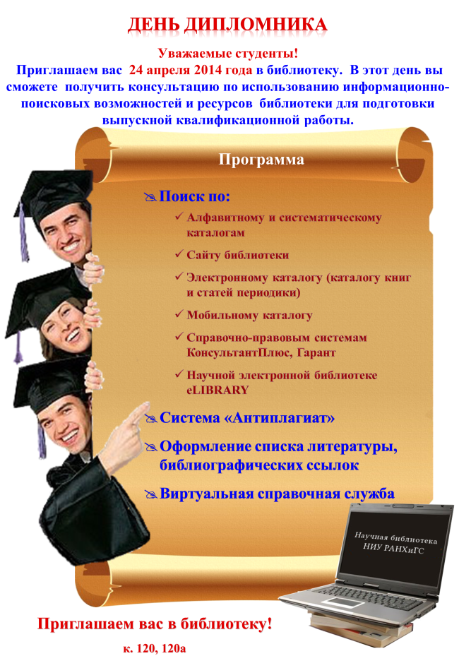 Главная » Новости библиотечно-ресурсного центра » Уважаемые студенты! 24 апреля 2014 года библиотека проводит День дипломника!