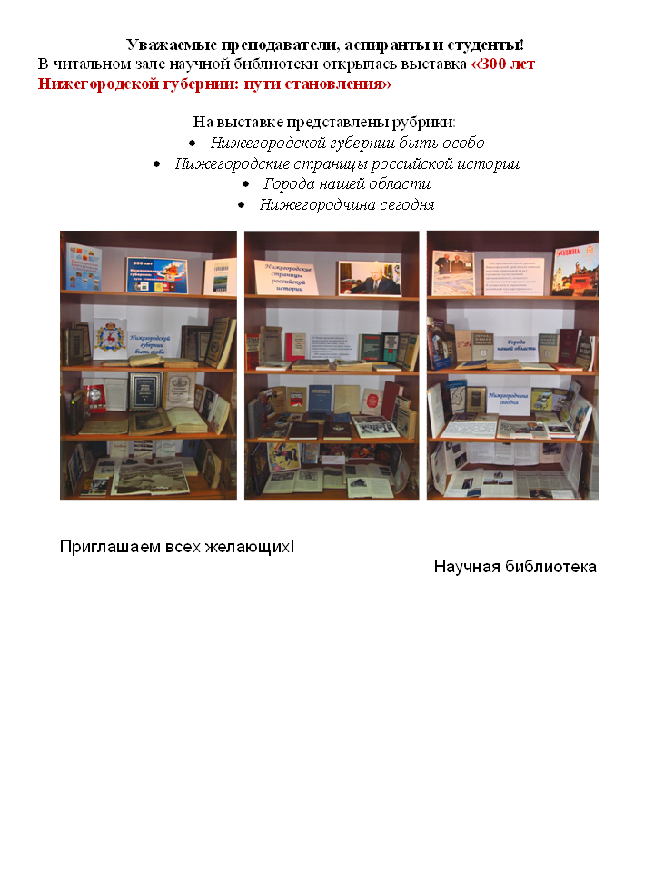Главная » Новости библиотечно-ресурсного центра » В читальном зале открылась выставка ‹‹З00 лет Нижегородской губернии: пути становления››