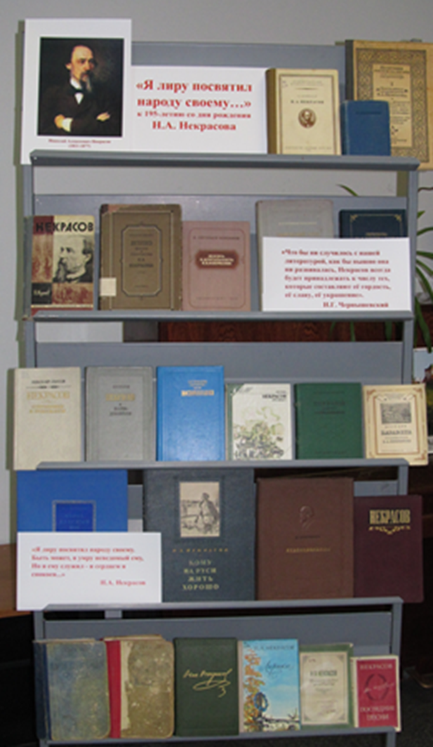 В ходе мероприятия функционировала книжная выставка «Я лиру посвятил народу своему…», на которой были представлены произведения о жизни и творчестве Н.А. Некрасова, а также его поэтические и драматические сборники.